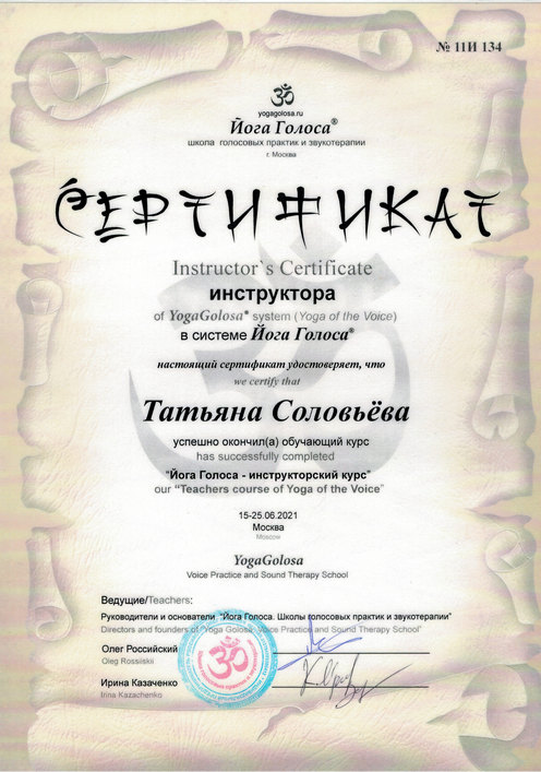 инструктор Йоги голоса – инструктор в системе «Йога голоса» – ведущая регулярной группы по голосовым практикам • высшее образование по специальности «психология», а также: – прошла обучение по программе «Интегративная голосовая терапия в практике психологического консультирования» – прошла обучение по программе «Возрождение природного голоса» – прошла обучение в Школе развития голоса «Радость звучать!» • музыкант, композитор, вокалист с большой сценической практикой